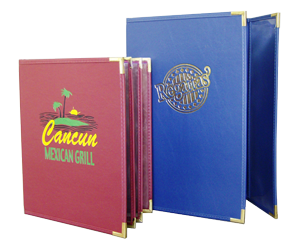 Royal Cafe Restaurant Menu Holders with clear pockets are ridged covers with durable faux leather (Saddle Calf) material. Quality is in the details with our Restaurant Menu Holders with clear pockets, heavy nylon stitching and heavy gauge vinyl for the clear pockets to hold your menus. These restaurant menu holders come with your choice of handsome protective metal corners and are customized with your restaurant logo. Royal Cafe Menu Holders with clear pockets are very durable, versatile and come in standard and custom sizes and materials including upgrades as shown below.
