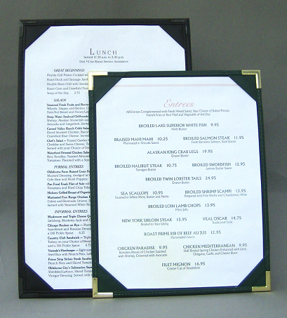 The Del Mar Menu Boards are elegant turned edge construction and available in Permalin – leather grained or Linen book cloth materials. The menus are held in place with your choice of corner catches, top and bottom bars or side bars which work great for larger double sided menu covers.